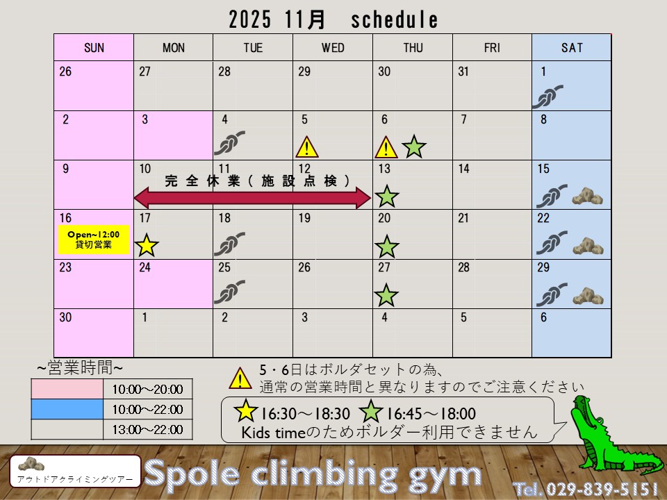 11月は5日(水)~6日(木)はボルダーエリアスラブ、100°壁のセットを行います。5日は終日、6日は18時までボルダーエリアのご利用ができませんのでご注意ください。
